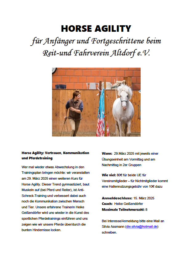 Wer mal wieder etwas Abwechslung in den Trainingsplan bringen möchte: wir veranstalten am 29. März 2025 einen weiteren Kurs für Horse Agility. Dieser Trend gymnastiziert, baut Muskeln auf (bei Pferd und Reiter), ist Anti-Schreck-Training und verbessert dabei auch noch die Kommunikation zwischen Mensch und Tier. Unsere erfahrene Trainerin Heike Geißendörfer wird uns wieder in die Kunst des sportlichen Pferdetrainings einführen und uns zeigen wie wir unsere Pferde über/durch die bunten Hindernisse locken.