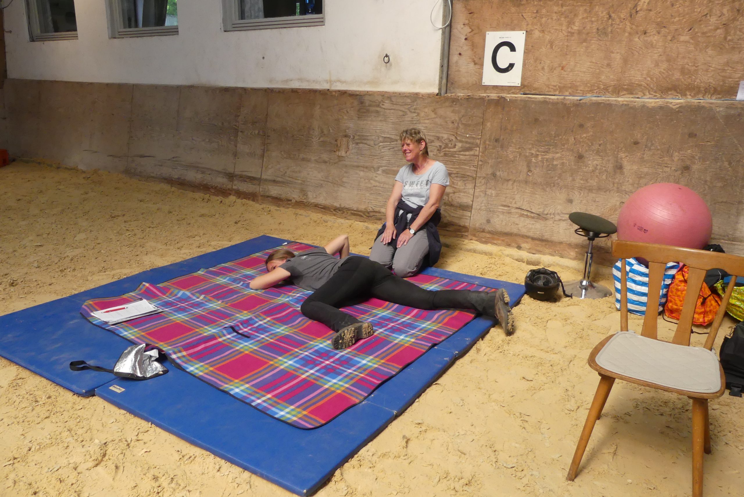 Danach ging es für jede Teilnehmerin in einer Einzelstunde aufs Pferd. Die Reiterin schilderte Katja am Anfang der Stunde ihr Sitzgefühl und ihr Ziel, was sie bezüglich Sitz und Einwirkung verbessern möchte. Durch die Aussage der Reiterin und Katjas Beobachtungen wählte sie eine Übung aus, die auf dem Pferd oder auf einer Bodenmatte ausgeübt worden ist.